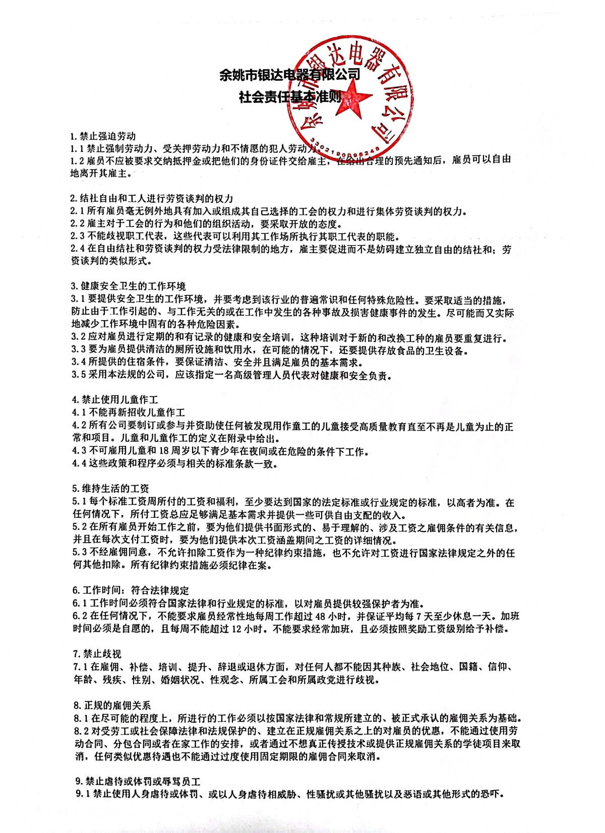余姚市銀達(dá)電器有限公司社會(huì)責(zé)任基本準(zhǔn)則